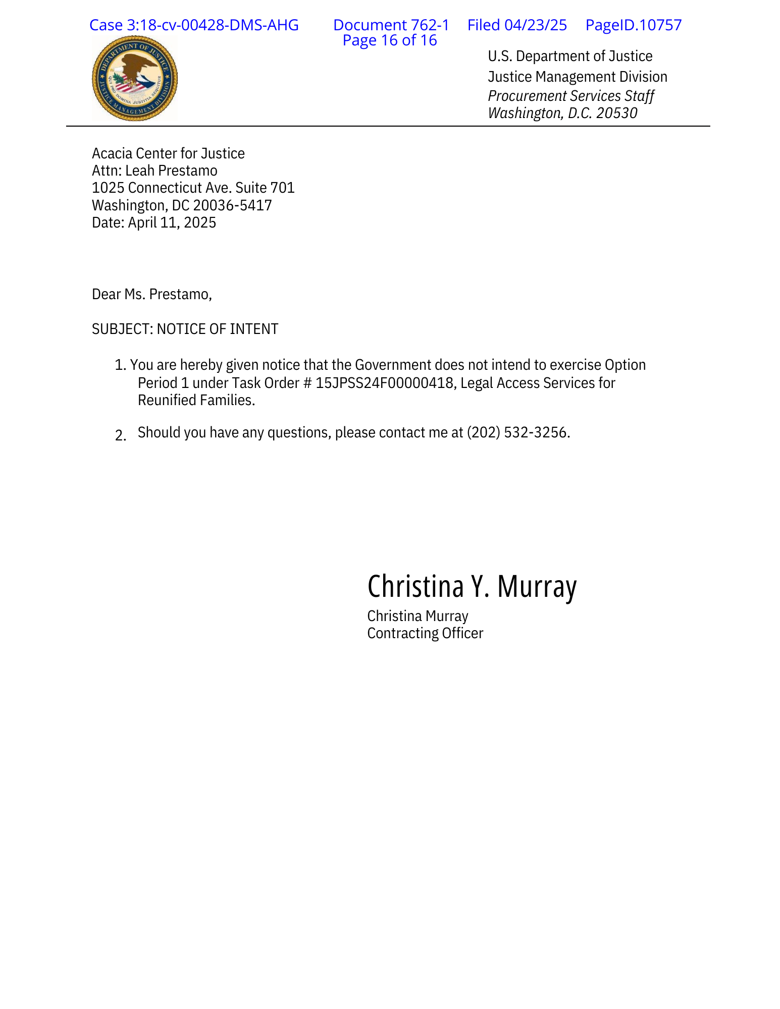 A copy of a notice-of-termination letter sent by the U.S. Department of Justice to Acacia Center for Justice, a nonprofit immigrant legal defense organization that has been providing legal services to members of separated families in accordance with a 2023 settlement between the Biden Administration and the ACLU.