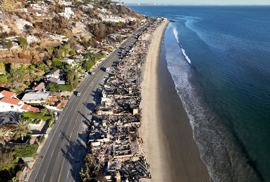 An aerial view of beachfront homes that burned in the Palisades Fire as wildfires cause damage and loss through the LA region on Jan.15, 2025, in Malibu, Los Angeles County. (Mario Tama/Getty Images)