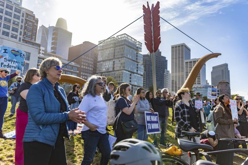 Dozens of Environmental Protection Agency (EPA) workers and supporters attend an Earth Day celebration rally to highlight the work they’ve done and to demand that the Trump administration stop dismantling the agency, in Rincon Park, in San Francisco, on April 22, 2025. (Gina Castro/KQED)