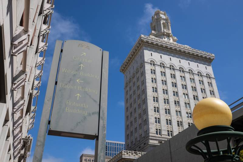Oakland City Hall in downtown Oakland on Aug. 2, 2023. The Oakland Public Ethics Commission is considering a parcel tax measure to fund its investigations and a public campaign financing program that lacks the money to go forward. (Martin do Nascimento/KQED)