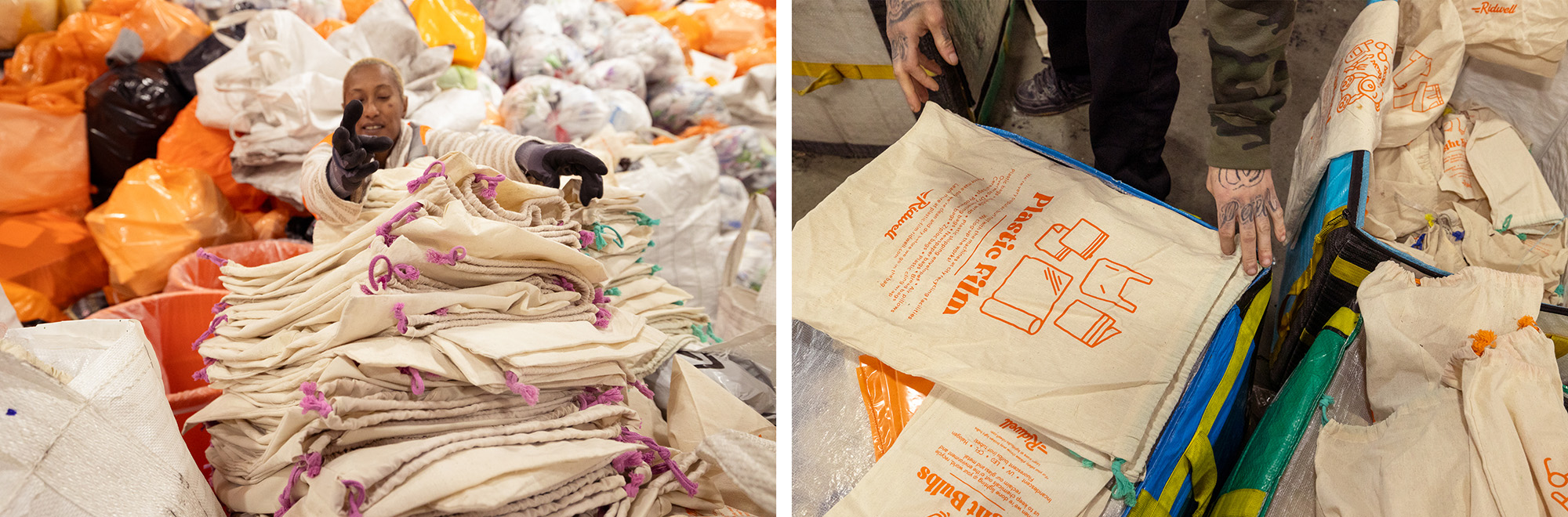 Left: Latoya Grant, a driver-flex, sorts mixed and clear plastics at the Ridwell processing plant in San Leandro. Right: Mike Coggins sorts reusable bags at the Ridwell plant. (David M. Barreda/KQED)