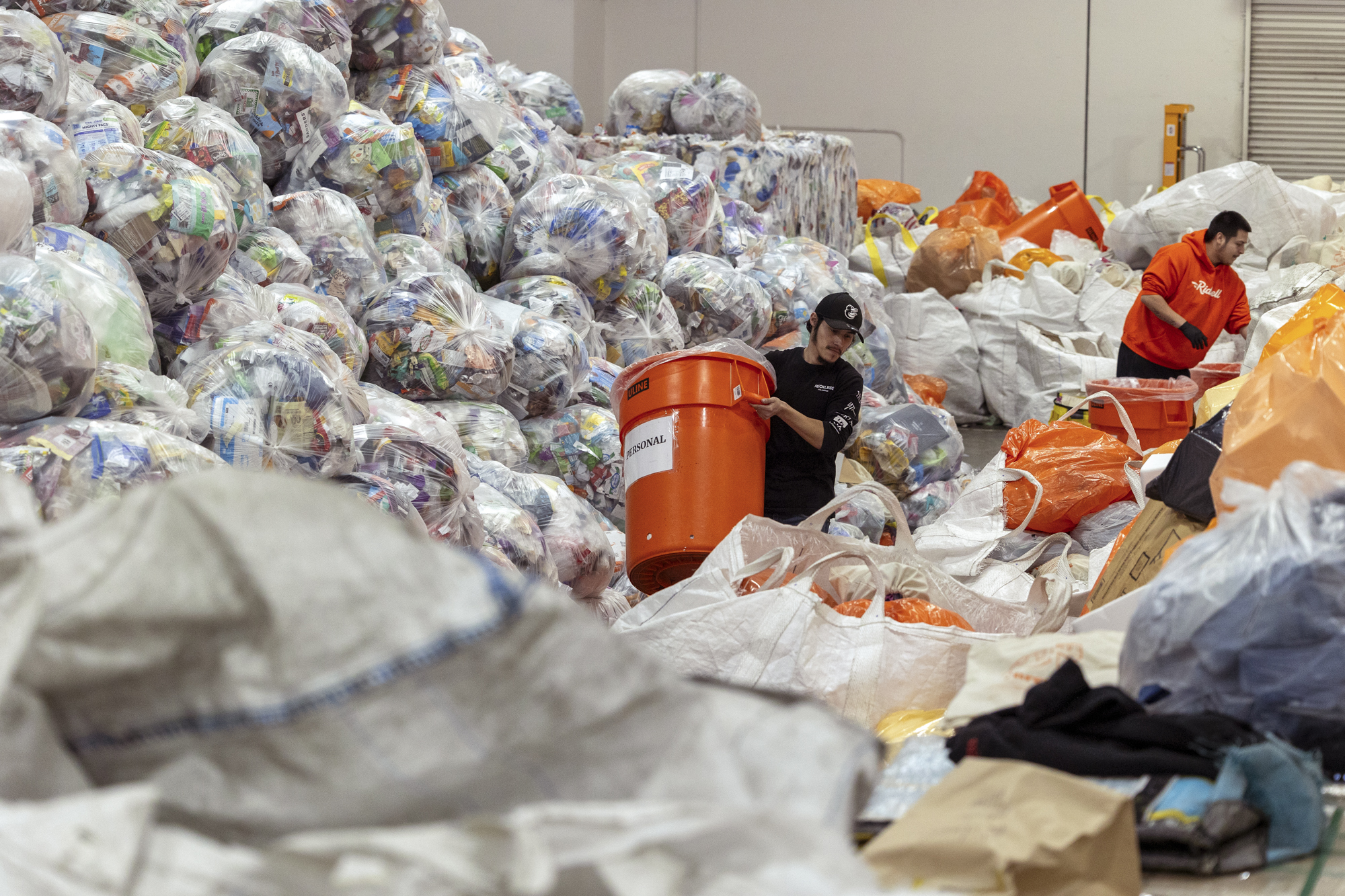 The warehouse is surprisingly quiet: no conveyor belts or other major machinery you’d find in a recycling facility — just a small crew of workers sifting through materials by hand.