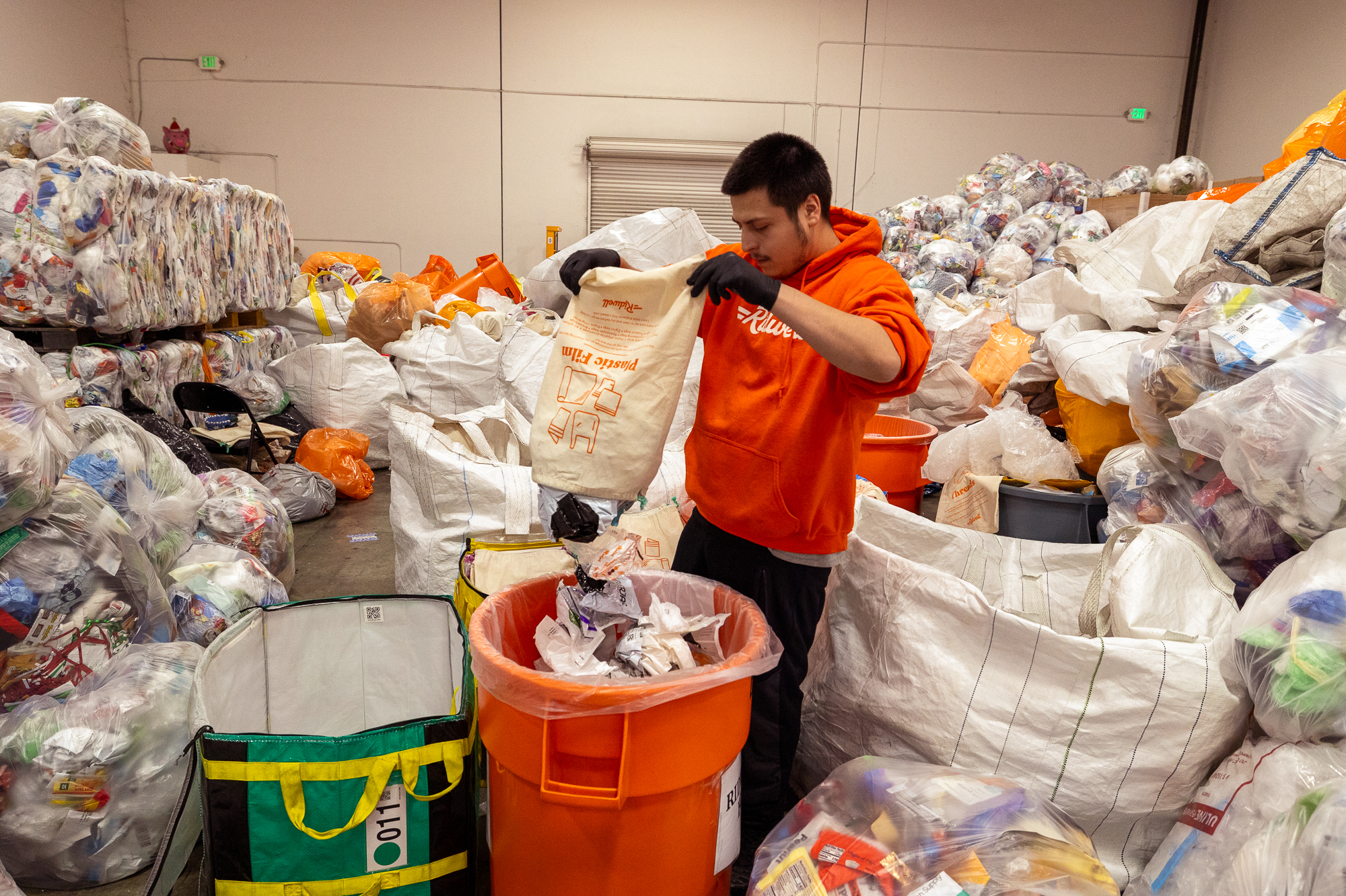 Juan Alvarado sorts plastics at the Ridwell processing plant. (David M. Barreda/KQED)