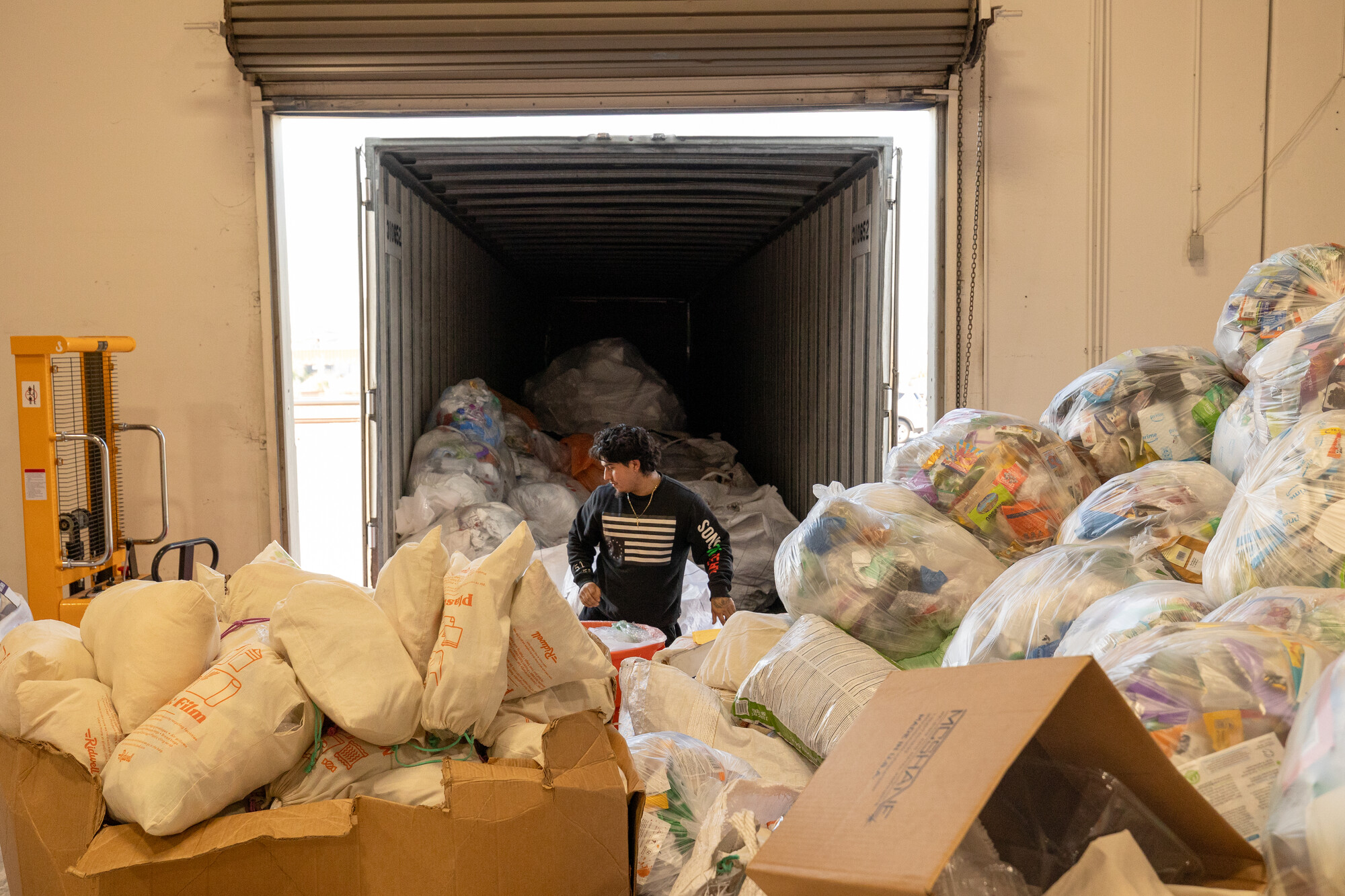 “Everything is trucked here. We’re probably on the brink of needing to find another facility or looking for more space,” Pan said, gesturing toward barrels of old batteries, a giant crate of plastic foam blocks, and a 15-foot-tall hill of bags, each packed with plastic film.